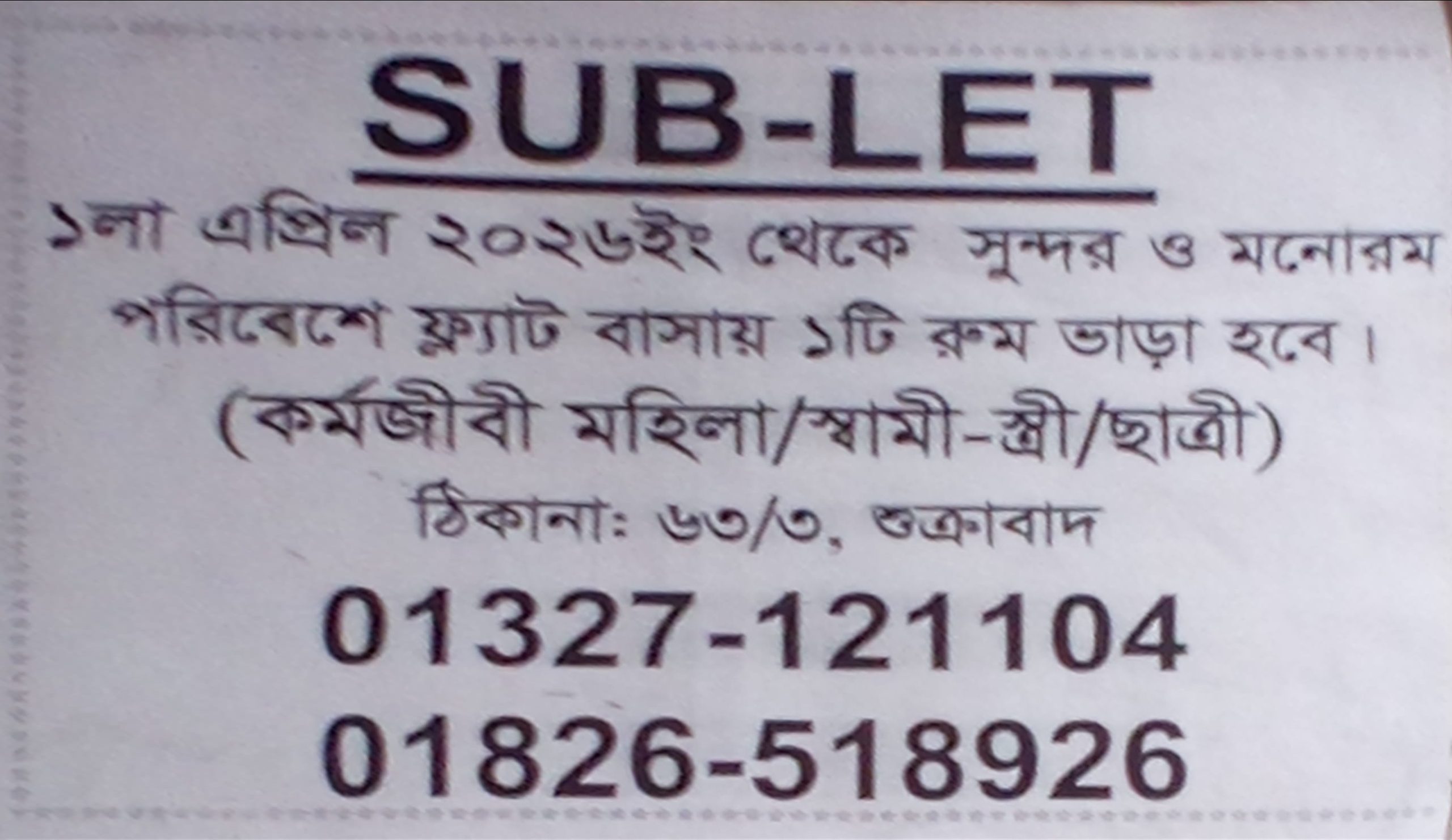 ফ্ল্যাট বাসায় ১টি রুম ভাড়া হবে